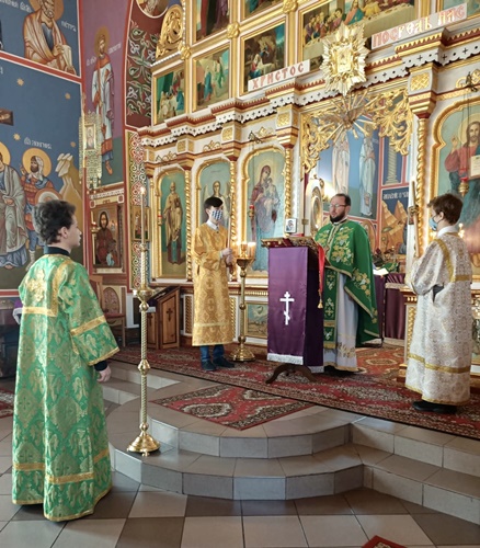 idącemu na dobrowolną mękę dla zbawienia ludzi. Podczas utreni brzmi prokimen zaczerpnięty z psalmu Dawida (8,3) . „ Iz ust mładenec i ssuszczych sowerszył jesy chwału” (Sprawiłeś, że usta dzieci i niemowląt oddają Ci chwałę). Podczas św. Liturgii śpiewany jest prokimen „Błahosłowen hriadyj wo imia Hospodnie, Boh Hospod i jawysia nam”. Apostoł zaczerpnięty jest z listu Apostoła Pawła do Filipian